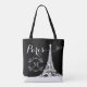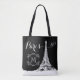 Diese schicke, schwarz-weiße Totasche ist mit einer weißen Eiffelturm-Grafik mit "Paris" in modernem Drehbuch geschrieben. Ein Monogramm, das Sie für Ihre persönlichen Daten einsetzen, wird durch eine weiße extravagante Schriftrolle gerahmt. Der Hintergrund ist schwarz. Entworfen von weltberühmten Künstler ©Tim Coffey.