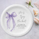 Chic bridal shower paper plates featuring an elegant purple coquette bow watercolor, "She's tying the knot" in a calligraphy script, and the bride's name and the shower date in simple modern lettering.