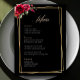 Elegantes, dunkelrotes und schwarzes Hochzeitsmenü mit schönen Blume und grünen Blätter. Eine bezaubernde Mischung aus Eleganz und gotischem Charme. Diese wunderschönen Einladungen sind in schwarz und rot gehalten. Die Kalligraphie ist elegant und schick und lässt sich leicht anpassen. Romantische und moderne blumengeschmückte Hochzeitsfeiern mit klassischen Farben, die nie aus dem Stil verschwinden.