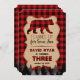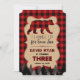 Joyeuse invitation anniversaire/bûcheron avec silhouette d'ours rouge plaid, mot rouge plaid TROIS pour l'année, une belle forme de papier rustique ancien avec cadre pointillé pour info. Utilisez l'outil Personnaliser pour ajouter vos informations. Pour plus d'informations, visitez s'il vous plaît, ma Plaid/Lumberjack Party Collection.