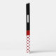 Chic iPhone 12 Gehäuse in schwarz, oben und ein Weiß mit rotem Glitzer sehen Polka Dot Druck, unten. Die Grafik eines roten Satinbändchens und des Bogens schmückt die Mitte und ein rotes Glitzer, das stiletto-Heelse aussieht, sind oben. Personalisieren Sie den weißen Text für sich selbst oder als großartige Geschenkidee.