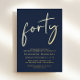 Erleben Sie Ihr 40. Geburtstagsgeschenk mit dieser schicken dunkelblauen Einladung mit "vierzig" in einem stilvollen Drehbuch, Ihrem Namen in eleganter Serifentypografie und den Party-Details in einfacher, moderner Schrift, alles in Ihrer Wahl von echtem Gold, Silberfolie oder Rose Goldfolie gerendert.