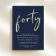 Erleben Sie Ihr 40. Geburtstagsgeschenk mit dieser schicken dunkelblauen Einladung, die "vierzig" in einem stilvollen Drehbuch und Ihrem Namen in eleganter Serif-Typografie präsentiert wird, alles in Ihrer Wahl von echter Gold-, Silber- oder Rose-Goldfolie gerendert, und die Party-Details in einfachen, modernen Schriften.
