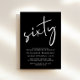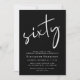 Chic Black Einladung für Ihre 60. Geburtstagsfeier mit "sechzig" in einem großen weißen Drehbuch präsentiert, Ihren Namen in eleganter weißer Serifentypografie und die Party-Details in schlicht weißer Schrift.