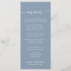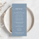 Moderne dustig blaue Speisekarte für Ihre Hochzeitsfeier, Verlobungsfeier, Probe-Dinner und andere Hochzeitsfeiern mit "Menü" in einem schicken weißen Kalligrafieschrift mit Swashes, Ihrem maßgeschneiderten Menü in weißer Typografie, Ihren Vornamen, verbunden mit einem Herz und Ihrem Veranstaltungsdatum.