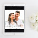 Moderne dustige blaue Hochzeitseinladung mit der Einladung in eleganter weißer Typografie auf der einen Seite und dem Foto überlagert mit "Happily Ever After" in einem schicken Drehbuch mit Swashes, Vornamen und Hochzeitsdatum, verbunden mit einem Herz auf der anderen Seite.
