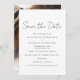 Schick Save the Date Hochzeitsankündigung mit "Save the Date" in einem minimalen modernen Drehbuch und Ihre personalisierten Details in einfacher Typografie. Auf der Rückseite befindet sich Ihr Foto, das mit Vornamen und Hochzeitstermin überlagert wird.