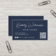 Eine schicke blaue Visitenkarte, die Ihren Namen oder Ihre Marke in einem modernen, weißen Signaturskript und Ihren Geschäftstyp oder Titel in einer klaren, weißen Schrift darstellt. Geben Sie Ihre Website-Adresse ein, um einen QR-Code zu erstellen, den Kunden und Kunden nach einer Liste Ihrer Produkte, Dienstleistungen, Stunden usw. suchen können, und fügen Sie Ihre Instragram- und Facebook-Benutzer-ID hinzu, damit die Kunden Ihnen folgen und sich mit Ihnen in sozialen Medien verbinden können. Fügen Sie zusätzliche Informationen auf der Rückseite hinzu oder verließ sie leer.
