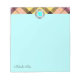 Chic Tartan Metallic Custom Script Monogram Cyan Notepad Elegant, moderne und modische anpassbare Notizblock verfügt über "personalisiertes Monogramm" auf metallischem Stahl, rosa / gelb karierte Tartan oben und "personalisierte Namensnotizen" unten auf zyanischem Hintergrund. Dieses schöne Notizblock kann als wunderbares Geschenk durch Hinzufügen von Namen oder Text / Änderung von Schriftart, Farbe, Größe und Position.