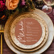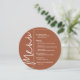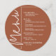 Eine runde Terracotta-Dinner-Karte bietet Ihnen Ihre Speisekarte mit schicken weißen Schriftzeichen, ideal für einen modernen Hochzeitsempfang, ein Hochzeitsdinner, ein Jubiläum-Party oder ein besonderes Dinner. Lassen Sie sich einfach mit Ihrem Dinner-Menü und Details persönlich verwöhnen. MEHR Farben in unserem Geschäft.