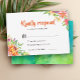 Moderne, helle tropische Blume themed wedding Details Karte mit modernen und Skripttypografie und schöne botanische Aquarellbouquets. Änderung der Hintergrundfarbe möglich unter "Weitere Anpassung". Eine alternative Aquarelltextur in Orange/Rosa steht unter "Weitere Anpassung" zur Verfügung, indem die grüne/blaue gestrichen wird. Eine solide Farbe auf der Rückseite kann auch so ausgewählt werden. Bitte kontaktieren Sie mich durch den Laden mit Fragen zum Design. Matching-Artikel in der Kollektion "Tropische Blütenhochzeit" erhältlich.