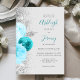 Die links Seite dieses eleganten, modernen Hochzeitseinladens besticht durch einen Blumenstrauß in türkisfarbenen und hellblauen Farbtönen, besticht durch silberne Imitate und Imitate Glitzer und besticht durch einen Glitzer aus silbernen Imitaten. Der anpassbare Text kombiniert türkisfarbenes Schriftzeichen mit kohlegrauem Kupferstich und kursiven Schriftart auf hellgrauem Hintergrund. Auf der Rückseite ist ein passendes türkisfarbenes und silberfarbenes Blumendesign.