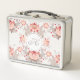 Schönes und elegantes Blumenmuster auf hellbraunem Damast-Hintergrund. Ausgereifte und feminine, anpassbare Metall-Lunchbox mit Monogramm auf weißem Rundtag. Alles ist individuell anpassbar: Sie können das Monogramm (Schriftart, Farbe, Größe und Position) und das Design (Größe und Position) einfach ändern, indem Sie auf die Schaltfläche Anpassen klicken. Passende Gefälligkeitsbox, Gepäck, Gepäckanhänger und mehr... Vergessen Sie nicht die ganze Kollektion Vintager Blumenmuster mit Monogramm.