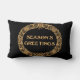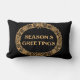 Ein festliches Lumbalkissen oder Kissen mit einem Weihnachtskranz aus Heiligem, Efeu, Poinsettias, Tannenzapfen und Tannenbaum. Dieser handgezeichnet Weihnachtskranz wirkt auf schwarzem Hintergrund goldfarben, mit "Season's Greetings" in dekorativer Schrift, auch in Goldeffekt.