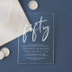 Erleben Sie Ihre 50. Geburtstagsfeier mit dieser klaren Acryleinladung mit "fünfzig" in einem schicken, weißen Drehbuch, Ihrem Namen in eleganter weißer Serif-Typografie und den Party-Details in einfacher, moderner Schrift.