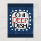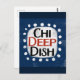 Ein lustiges und niedliches typografisches Message-Design, das "Chi Deep Dish" sagt. Er hat schwarz-roten Text auf einem weißen Rechteck mit funky, spielerisch weißen Punkten, die ihn umgeben, alle auf blauem Hintergrund.