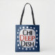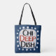 Ein lustiges und niedliches typografisches Message-Design, das "Chi Deep Dish" sagt. Er hat schwarz-roten Text auf einem weißen Rechteck mit funky, spielerisch weißen Punkten, die ihn umgeben, alle auf blauem Hintergrund.