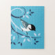 Dekorative Vogelkunst auf Puzzles von Chickadee, die auf stilisierten Zweigen im wirbelförmigen Muster gekrönt sind.