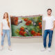 Vögel im Apfelgarten während der Herbsternte. Zwei schwarz gekappte Kichererbsen stehen in einem Apfelbaum, während ein drittes Kichergewächse auf einem gewebten Holzkorb sitzt, der mit reifen, frisch geernteten, marktreifen Früchten gefüllt ist. Realistische Kunstwerke, die aus einer Ölmalerei des Künstlers Crista S. Forest entstanden sind.