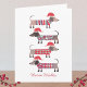 Adorable petits chiens de Noël Dachshund Wiener ou Saucage dans des vêtements douillets en hiver et chapeaux de Père Noël. Customisez en changeant les salutations à l'avant et à l'intérieur, et changez ou supprimez les noms.