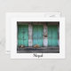 Carte postale de chiens errants dormant dans la rue devant de vieilles portes vertes sales à Katmandou, la capitale du Népal avec une frontière blanche et le texte : 'Népal'.