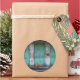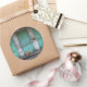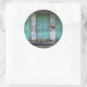 Un autocollant photo rond avec des chiens errants dormant dans la rue devant de vieilles portes vertes sales à Katmandou, la capitale du Népal.