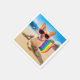 Dieses niedliche Foto verfügt über einen Chihuahua-Hund am Strand, der eine Gay Pride-Fahne in Regenbogenfarbe trägt.