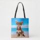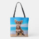 Chihuahua Hund sitzt am tropischen Strand Tasche