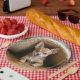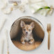 Ein kleiner, bräunlicher und weißer Chihuahua-Hund schneidet sich mit leuchtend ausdrucksvollen Augen unter einem weichen Teppich aus