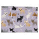 Niedliche Chihuahua-Hunde in Schwarz, Braun, Bräune, Creme, Grau und Blau sitzen und stehen verstreuten Hundeknochen und Pfotendrucken auf einem leicht lila Hintergrund.