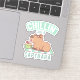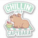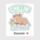 Ein niedliches Doodle einer Capybara mit Sonnenbrille, die sich auf einem Badetuch entspannen und ein frisches Kokosnuss trinken. Die lustige Unterschrift lautet "Chillin Like A Capybara".