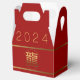 Goldenes Chinesisches Drachenideogramm mit geprägtem digitalen Effekt auf transparentem Hintergrund. Design auf Corporate Gable Gvor Box Geschenk mit Texten: HAPPY NEW YEAR, groß 2024 und Geschäftsname Adresse auf dunkelrot Hintergrund. Sie können den Text (Schriftart, Farbe, Größe und Position), die Hintergrundfarbe, die Größe des Designs ändern, indem Sie auf die Schaltfläche Anpassen klicken. Erhältlich in Würfel und mehr... Passende Zuhause-Produkte, Büroprodukte, Handwerksartikel, Grußkarten und mehr... Ideal für Chinesisches Neujahr des Drachen oder Geburtstag (Menschen geboren im Drachenjahr). —