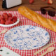 Dieses Plattendesign besticht durch blaues Chinoiserie-Blumenmuster auf einem rot-rosa Hintergrund.