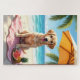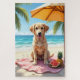 Ein ruhiger Chinook genießt einen friedlichen Strandmoment unter einem stilvollen Sonnenschirm, umgeben von frischen Früchten und sanften Ozeanblicken. Der malerische Stil schafft eine warme und elegante Küstenatmosphäre.