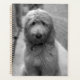 Un adorable chiot en peluche Goldendoodle assis sur un jardin béton marchent le long d'un mur en brique en noir et blanc.
