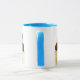 Un Ringer Mug blanc avec une jante bleu poudre et une poignée avec un cupcake au chocolat de chaque côté, surmonté d'une fraise et crème. 'N'importe qui pour un cupcake' est écrit entre les deux cupcakes en bleu. Le dessin est tiré d'un collage de papier peint à la main par Judy Adamson. Vous pouvez également être intéressé par d'autres modèles de cupcake de Judy Adamson sur des cartes de voeux et des T-shirts.