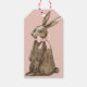 This Easter gift wrap has a hand watercolored chocolate bunny with a pink bow on a pink background.