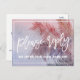 Cette carte postale RSVP est idéale pour une destination ou un mariage sur la plage. L'aménagement comprend un superbe coucher de soleil couleur rose, violet et bleu avec un palmier soufflant dans la brise. Cette carte postale de réponse mariage demande à la clientèle quel repas elle souhaite à la réception.