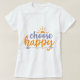 This design features the uplifting quote “choose happy” in a cheerful and eye-catching graphic style. The word “choose” is written in purple, while “happy” is in a warm orange tone. Above “choose” is an illustration of a rising sun in orange, symbolizing a bright and hopeful beginning. Below “happy” is a purple arrow graphic, pointing forward as if guiding positive energy ahead. The overall composition conveys a message of consciously choosing happiness.