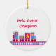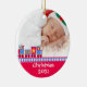 Der erste Weihnachtsschmuck des süßen Babys aus einer runden Keramik mit hübschem Goldschnur. Grafik eines farbenfrohen Spielzeugzuges, der an einen roten Hintergrund grenzt, am Ende des Ornaments, und ein individuelles Foto, oben auf dem Ornament. Weißer Text unten und auf der Rückseite ist vollständig anpassbar. Personalisieren Sie den gesamten Text und das Foto Ihres Babys, für ein süßes erstes Weihnachtsfest oder als ein hübsches Geschenk für die neuen Eltern oder Großeltern.