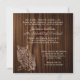 Joli faire-part de mariage carré dans un beau look de bois brun foncé. Les graphiques de hibou assis sur une branche sont faits dans un ton de bois blond plus clair et décorent le bas gauche de l'invitation. Le texte, en crème, est entièrement personnalisable et prêt à être personnalisé pour votre journée spéciale.