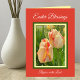 Diese wunderschöne Christliche Osterkarte zeigt ein Foto von orangen und gelben Tulpen, umgeben von einem gelben und grünen Rahmen. Die Worte "Ostersegmente" erscheinen oben in einem eleganten Skript auf orangefarbenem Hintergrund. Unter den Blume sind die Worte: "Freude am Herrn." In der Karte, ist ein schönes Ostervers. Urheberrechtsdesign und Wörter Kathy Henis