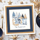 Christliches Weihnachtspapier Napkins mit Typografie-Design und modernen blauen Weihnachtsbäumen, Kreuz und eigenem Familiennamen. Kate Eden Art