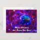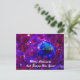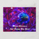 Illuminierter Weihnachtsbaum, rot und blau Farben. Blauer Zierball. Reflektion eines grünen Weihnachtsbaumes auf einer Kugeloberfläche. Fröhliche und fröhliche Stimmung. Text Frohe Weihnachten und glücklich Neues Jahr. Horizontal ausgerichtete Postkarte. Sie können das Bild und den Text ändern oder löschen.