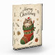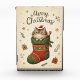 A festive illustration features a cute tabby cat wearing a Santa hat, nestled inside a green and red Christmas stocking. The stocking is decorated with traditional patterns. Above the cat, the words "Merry Christmas" are written in a decorative script. The background is a soft beige color, adorned with stars, dots, and sprigs of greenery.