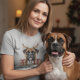 "This high-quality illustration features a detailed portrait of a noble Boxer dog with its characteristic square jaw and expressive, soft eyes. The dog is given a festive touch with small reindeer antlers adorned with golden ornaments and holly. Two beautifully wrapped Christmas presents with red ribbons sit prominently on either side. This graphic is ideal for personalized holiday gifts for Boxer owners, pet-themed Christmas cards, apparel, or home decor."