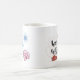 Cute steaming mug of hot cocoa with marshmallows, surrounded by falling