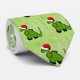 Grüner Dinosaurier in einer Weihnachtsmannmütze, mit einem Weihnachtskranz um den Hals