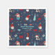 Add your name and celebration date to these paper napkins with whimsical holiday design featuring Santa cupcakes, snowmen, gift boxes, string lights, and snowflakes on a dark blue background.
