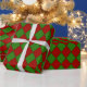 Dieses kühne und lebendige Design zeichnet sich durch ein reichhaltiges rotes und grünes Harlekin-Muster aus, das in schwarz umrissen ist. Es macht ein schönes Verpackungspapier für diese besonderen Geschenke.